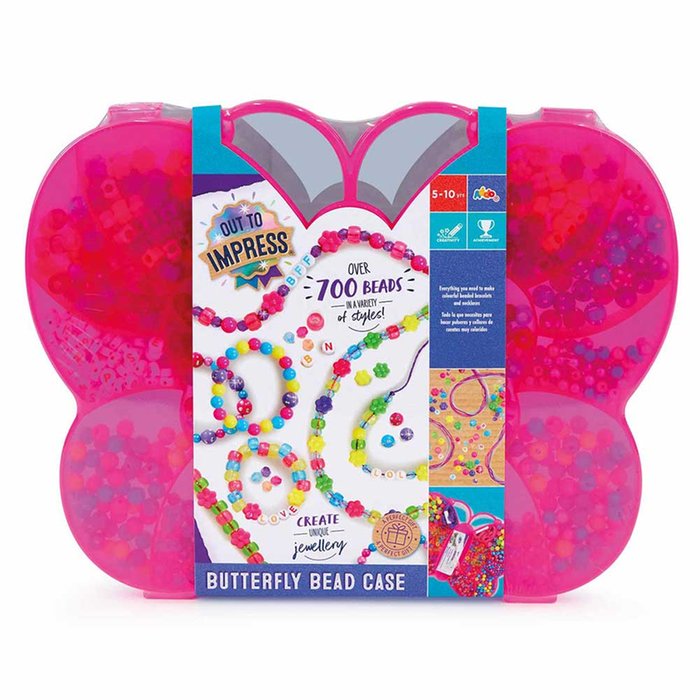 Create your very own necklaces, bracelets and more with this unique Butterfly Bead Case from Out To Impress. Let's make beautiful jewellery with over 700 beads of all different colours, shapes and sizes. This adorable pink butterfly-shaped case contains everything you need for hours of fun.