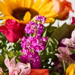 Bright sunflowers shine alongside warm orange and cerise roses, with pink alstroemeria and stocks for a soft touch. Finished with fresh pistache foliage, this colourful bouquet is full of cheer.