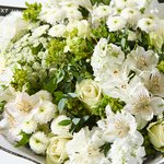This elegant bouquet features white roses, alstroemeria and stocks, with delicate santini and ammi for a soft, timeless look. Fresh greenery and a chic gift bag make it a stylish surprise, perfect for birthdays, anniversaries or simply to say ‘I’m thinking of you’.