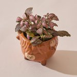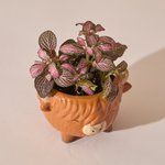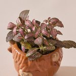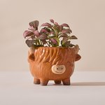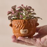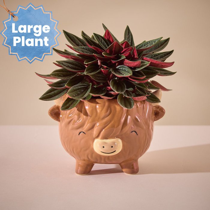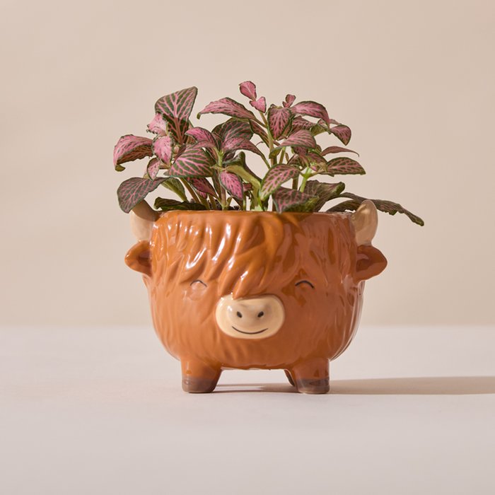 With its round nose and its shaggy wavy mane, this charming highlander cow pot has been teamed with the striking pink leaved Fittonia to make a winning combination. This makes a unique gift for any avid plant or cow lover. Wait for the plant to wilt a little before re-watering and situate in a bright environment.